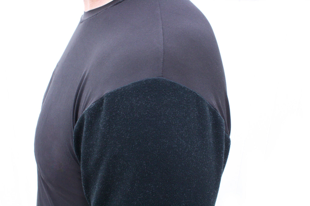 The fabric that makes up the arms of the Thermosleeve keeps you amazingly warm without piling on the weight. The brushed exterior provides loft to trap warm air against the arms while remaining flat on the skin to avoid bulk and bunching up under your long sleeve shirt or other outerwear. It is thicker and heavier than the torso material, but still thin enough to easily wear under any long sleeve shirt. This fabric is an ultra-warm, fabric with smooth interior to easily slide on and off while providing a chafe-free flatlock seam construction.